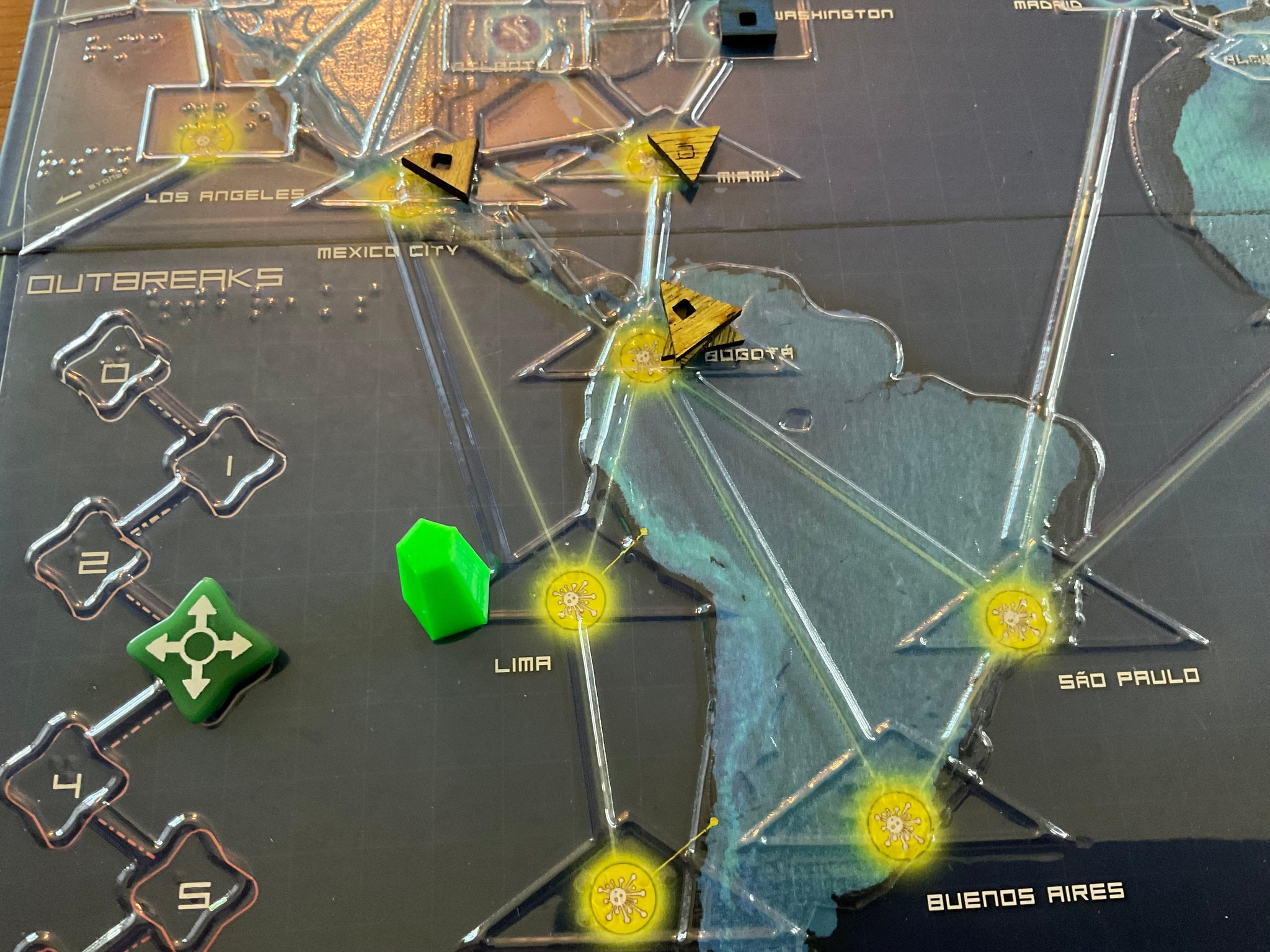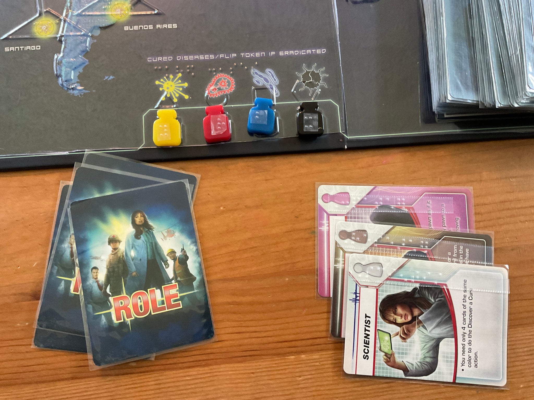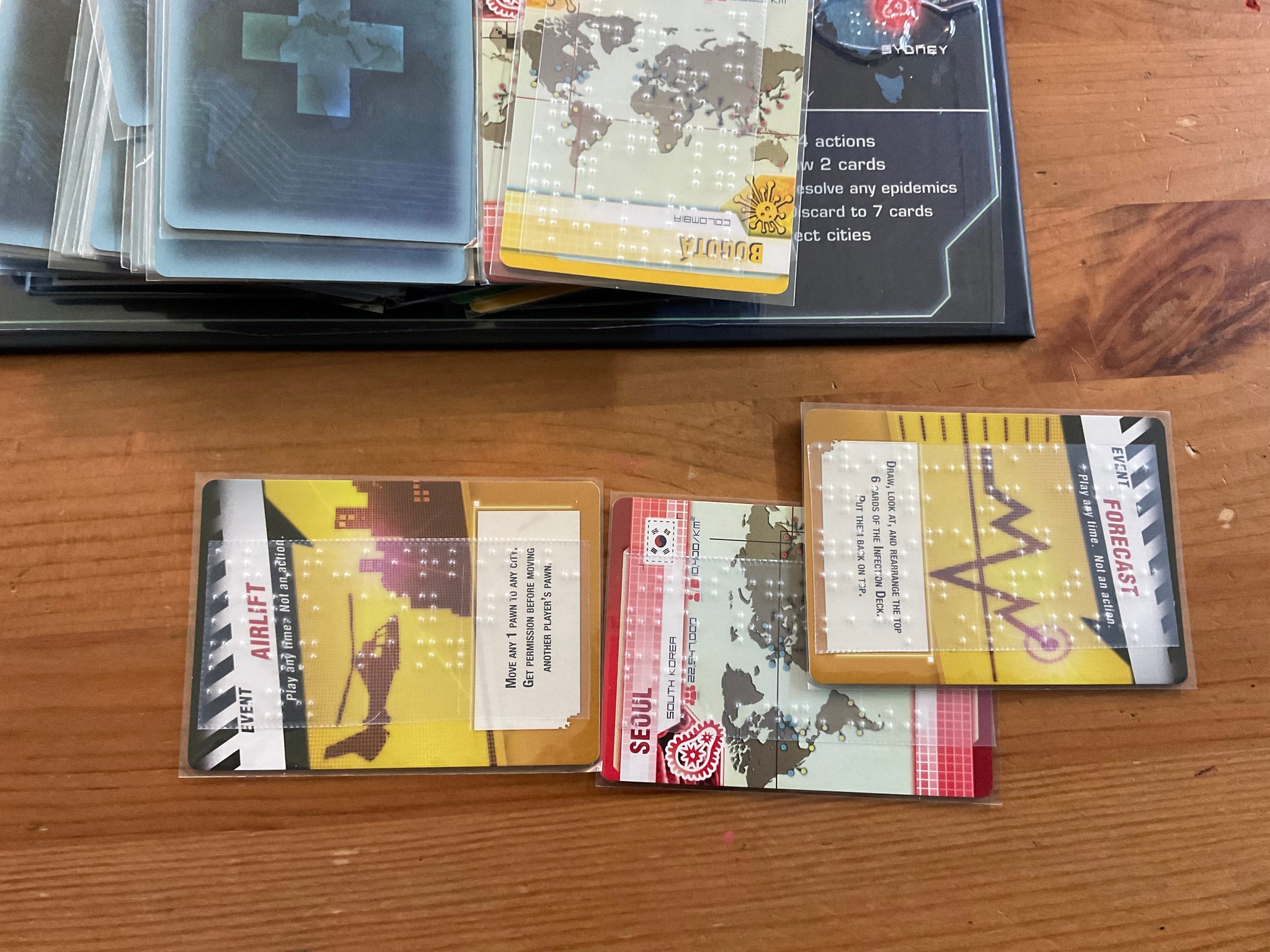 Includes braille to put card titles on cards and reference sheets for complete card text. Also includes complete thermoformed board overlay for the game board. It has replacement 3d printed tokens for the viruses. It also has a reference mini map.